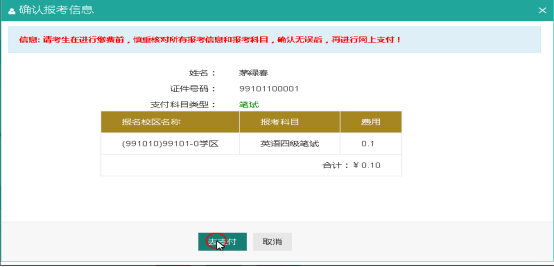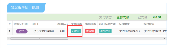 3.考生要在规定缴费时间内完成网上缴费,缴费时先缴笔试报考费,再缴口试报考费。未完成缴费的,系统会在24小时后删除考生报考信息。信息删除后,报名规定时间内考生可重新报考。考生科目报名成功的唯一标识是:对应科目的支付状态为“已支付”。