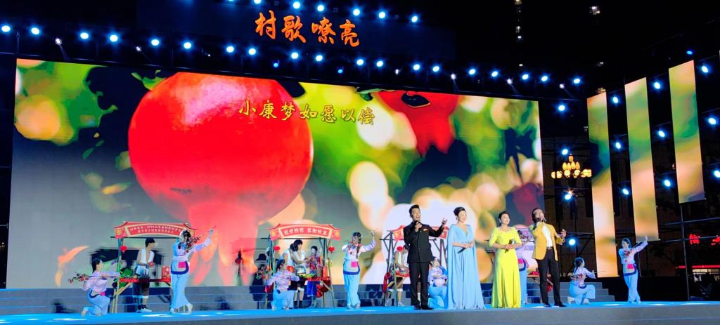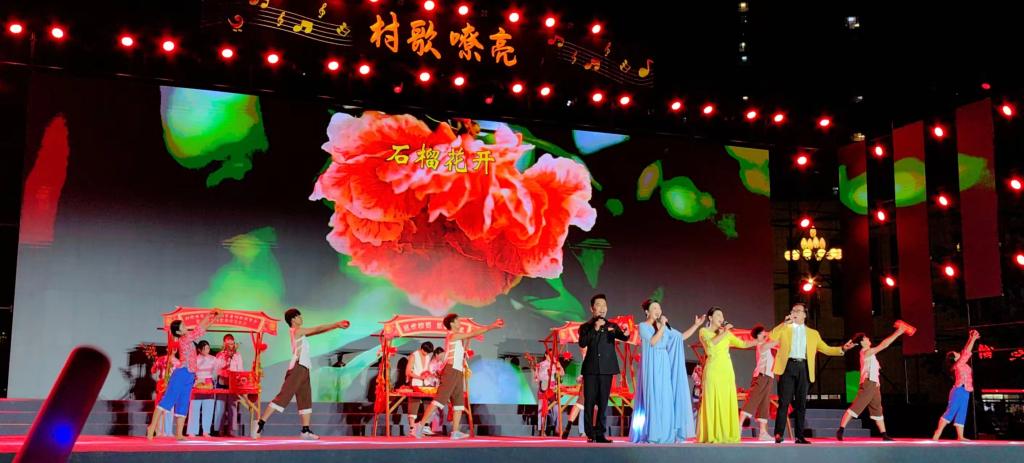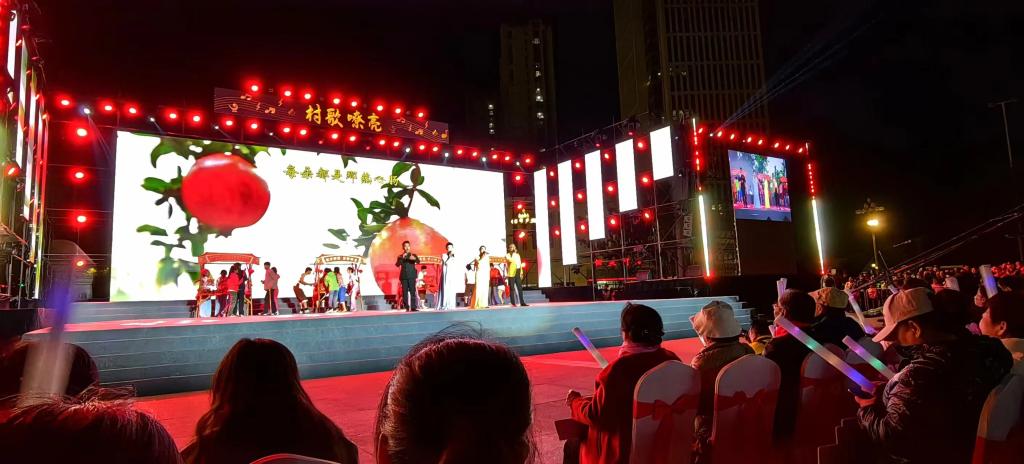 颁奖晚会以“村歌让乡村更美好”为主题,分为“美丽的家园”“幸福的生活”“传承的力量”三个篇章,通过歌曲演唱、歌舞情景表演、情景短剧、现场采访等多种形式,讲述村歌背后的故事,展示全省乡村振兴的丰硕成果,为观众奉献了一场接地气、冒热气、有生气的“村歌盛宴”。我市参演的节目《石榴花开贵客来》由公海gh555000aa线路检测、枣庄市音乐家协会、公海gh555000aa线路检测红石榴艺术团舞蹈团组织创排,以表演情景剧的创新方式,向全省人民展现了石榴大丰收的喜人情景。参演文艺工作者按照颁奖晚会整体要求,精心谋划设计,伴舞融合情景剧,演唱贴近新生活,专门设计定制了货架、石榴枝、簸箕、麦穗、大马牙石榴等物品,组织20余名参演人员历经近一个月的排练走台,努力提升舞台表现力,生动诠释了我市大力推进石榴产业高质量发展的丰富内涵,展现了公海gh555000aa线路检测广大文艺工作者的良好形象。