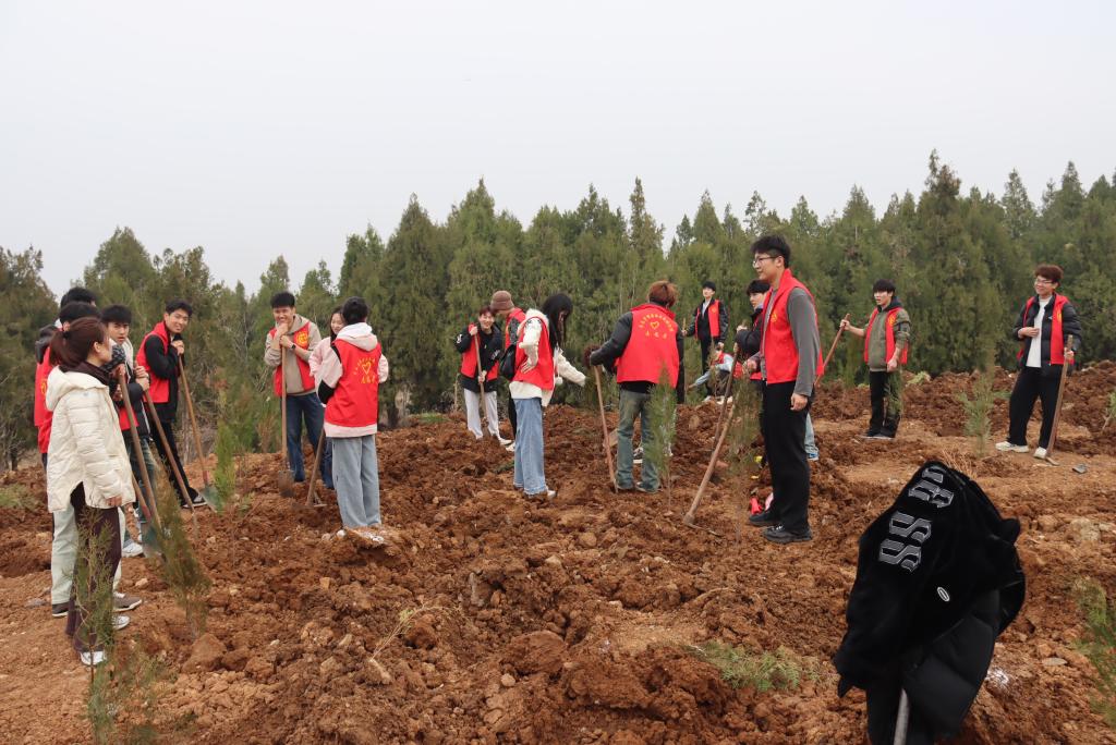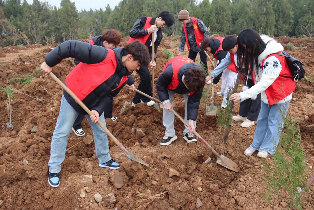 活动当日,志愿者们身着整齐的志愿者服饰,以饱满的热情投入到植树活动中,在带队教师的悉心指导下,志愿者们分工明确、配合默契。有的同学挥动铁锹,奋力铲土;有的同学则小心翼翼地扶起树苗,确保其笔直挺立;还有的同学专注于填坑,将泥土轻轻覆盖在树苗根部,每一个动作都一丝不苟。志愿者们以实际行动诠释着 “奉献、友爱、互助、进步” 的志愿服务精神,用辛勤的劳动践行着可持续发展的理念。