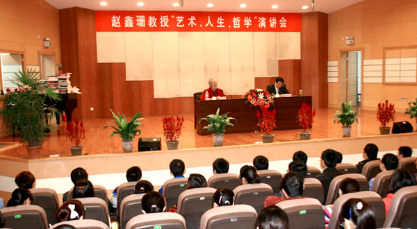 在历时两个半小时的时间里,赵鑫珊教授以其深厚的底蕴和学养以及朴素真挚的语言,畅谈艺术、哲学、人生等话题,感悟人生,沉思生活,剖析社会,解读自然,并娴熟于东西方文化的比较、透视,给人以深沉之感、振拔之气,极具感染力。他说,“我把自己当做磨盘,上盘是理科,下盘是文科,轴就是哲学”。“我把自己比喻成一头毛驴,热情,不知疲倦”。“我把我的哲学看作钟摆,两端是科学和艺术,我在它们之间不停地摆动,亲近科学才可信,热爱艺术才可爱,这就是我的哲学,既可信又可爱”。李白、陈子昂、孟子、庄子,普郎克、爱因斯坦、贝多芬、莫扎特,乌鸦、麻雀、狼嚎、婴啼……从古至今,从中到外,从动物到人类,从宗教到科学,赵先生引经据典,纵横捭阖,主持了一场与古人的对话,与“神灵”的交流,引领听者在美妙的王国里进行了一场心智的漫游、灵魂的洗礼。他告诫同学们“功夫在诗外”,除了掌握基本的技巧外,还要多多关注课外的东西,仰望星空,具有“诗人+哲学家”的气质;他希望“判天地之美,析万物之理,养浩然之气”成为大学的精神。