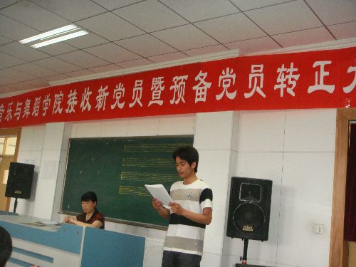2011年6月3日下午一点半,公司召开了接收预备党员暨预备党员转正支部大会。本次会议由公司党总支副书记高萍同志主持。艺术实践教研室主任马体亚,辅导员张昆、杨伟出席会议。