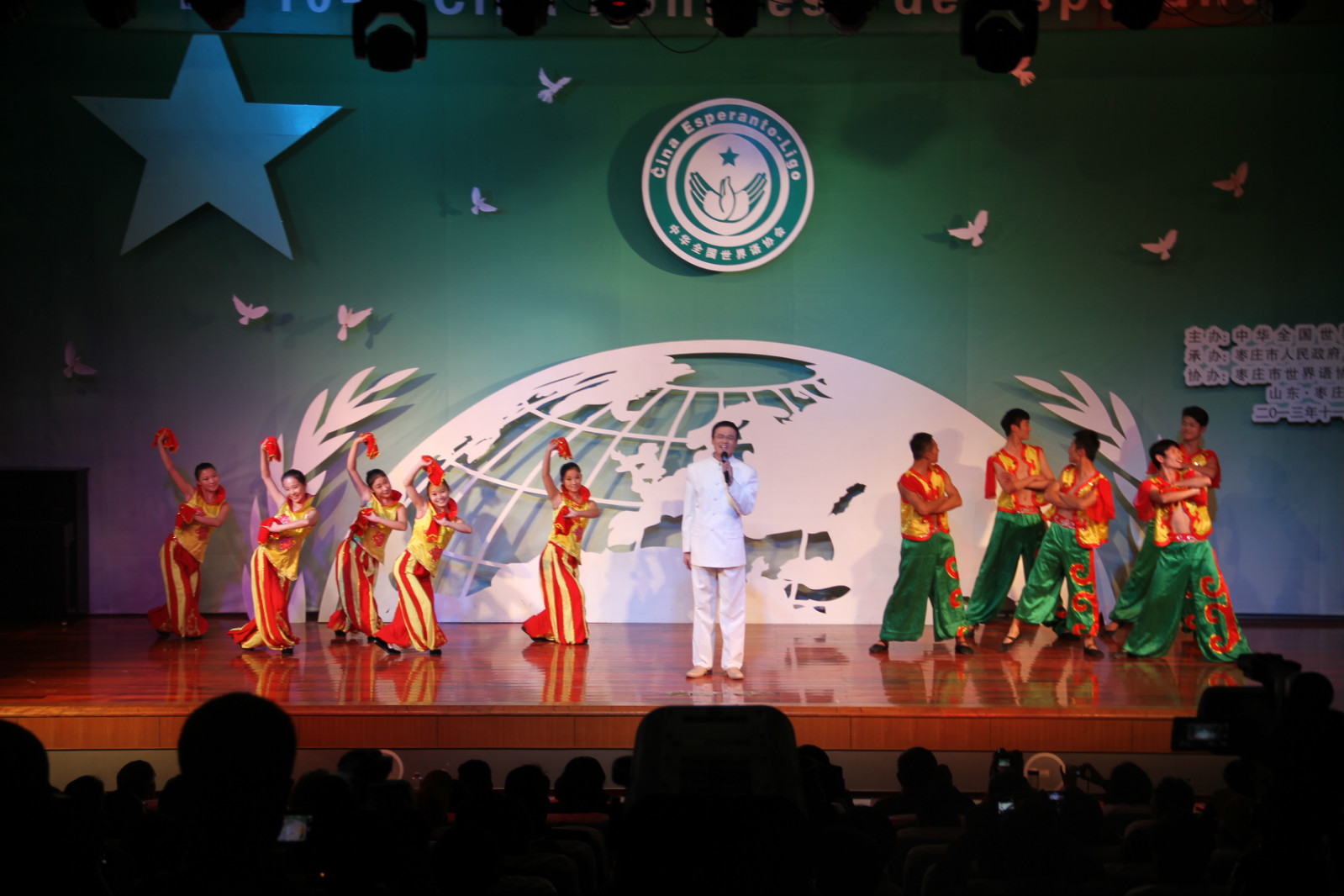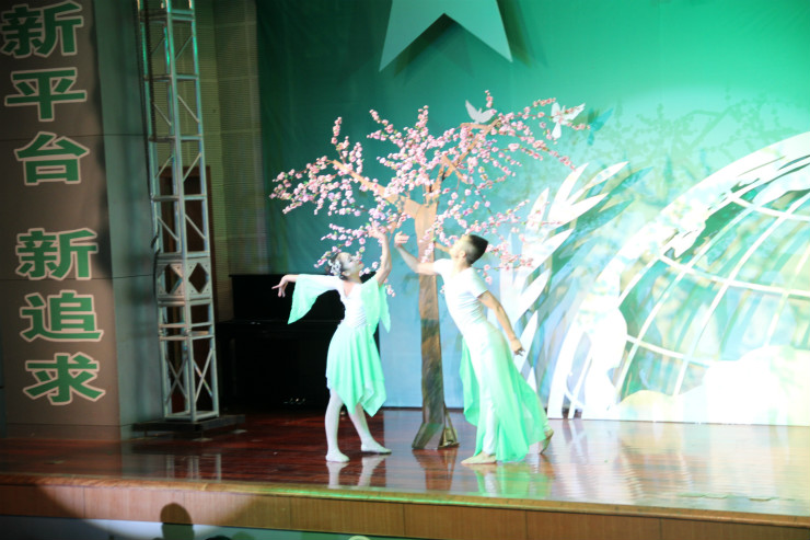 伴随着青年合唱团的清脆歌声,“春来了,春来了,多么美好,多么美好”晚会拉开序幕。第二个节目是由青年舞蹈团带来的群舞《碧荷扮绿微山湖》,引得外国友人赞叹声不绝于耳。深情感人的男声独唱《有一个美丽的传说》赢得观众们的阵阵掌声。接着器乐合奏《巅峰》更是将本场晚会的气氛推向了最高潮,西洋乐器和民族器乐的组合,演员们娴熟的技巧和具有表现力的演出让观众无不沉浸在中外合璧的美好情境中。民族交响乐团带来的《花好月圆》、《步步高》成为了今晚汇演的一大亮点。本次汇演的每一个节目都深深触动着台下的观众,一次次把他们带到鲁南文化的诗情画意中。晚会在青年交响乐团演奏的《拉德茨基进行曲》中完美落幕。此次晚会秉承新机遇、新平台、新追求的主题,将世界语文化成功的渗透到每一个人心里。