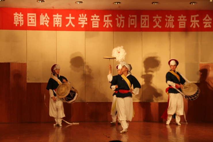 接下来的四物游戏环节,将本次交流会推向了最高潮,只见演员们身着韩国特色的服装,手持打击乐器,热情洋溢的敲打着,振奋了在场的每一位观众,同时也使我们对韩国民俗文化有了更加深入的了解。