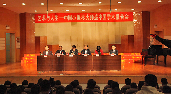 接着盛中国大师学术报告正式开始。盛先生从9个方面对艺术·人生·哲学进行了科学的阐述:关于演奏基本功与表现手段;关于音乐情感与人心向善问题;关于作品分类与“喜欢”和“应该”的结合问题;关于本与根的统一理解;关于美与丑;关于点化人生与个人修炼;关于精神与物质;关于做人与心中装着人民的辩证统一关系;关于艺术大美与人生大爱的大成问题。盛先生用联系的观点、独特的视角,敏锐的思辨和精确的讲解,准确诠释了音乐·灵魂·文化·国魂的教育理念和完美人生。他春风化雨、润物无声的讲课方式,让我们沉浸在美妙的音乐艺术海洋里,尽情沐浴,不愿离岸。