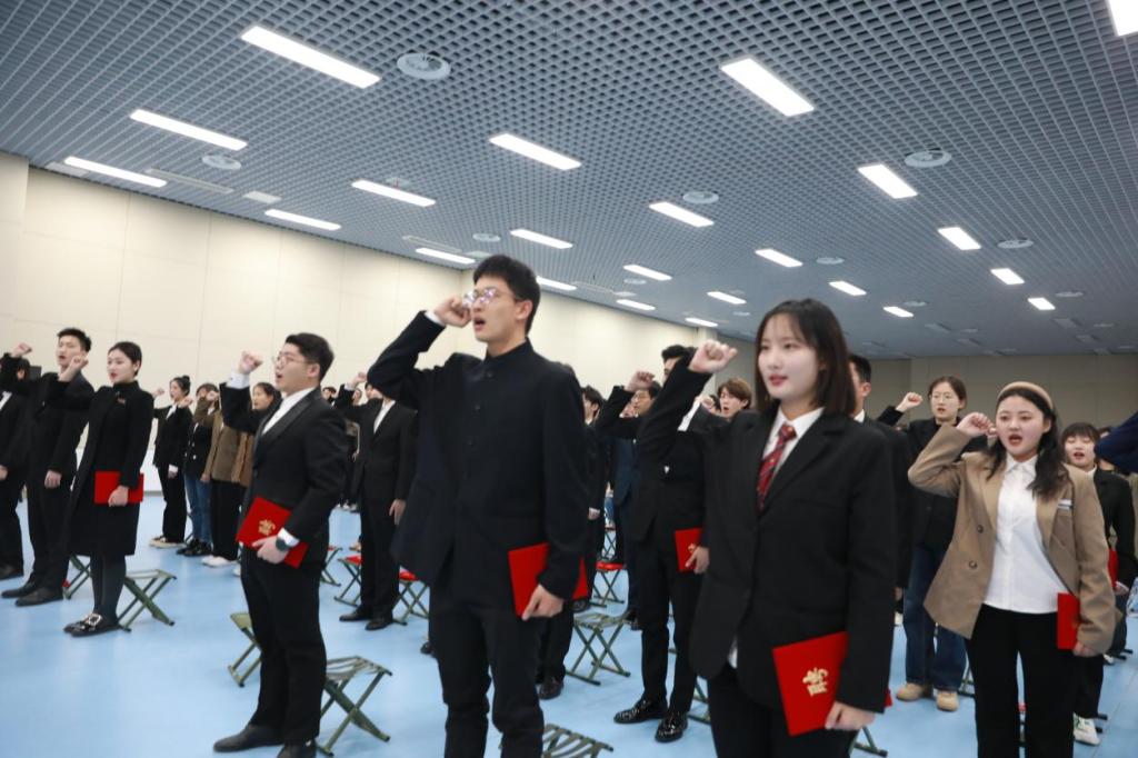 在嘹亮的国歌声中,换届任命大会拉开了序幕,团总支书记刘丹丹郑重宣布了60位员工干部的任命。领导老师为新任员工干部颁发聘书,亲切握手嘱托并合影留念。新任员工会·老员工艺术团主席兼团长朱方晓带领2023届员工干部宣誓,誓言整齐划一、铿锵有力,将任命大会推向高潮。