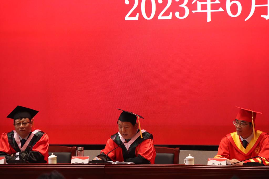 公司党总支副书记褚衍彪宣读《公海gh555000aa线路检测2023届毕业生学士学位授予的决定》及获得学士学位员工名单,毕业生们在欢快的音乐声中走上主席台,副董事长安涛依次为他们拨穗正冠、颁发学士学位证书并合影留念。