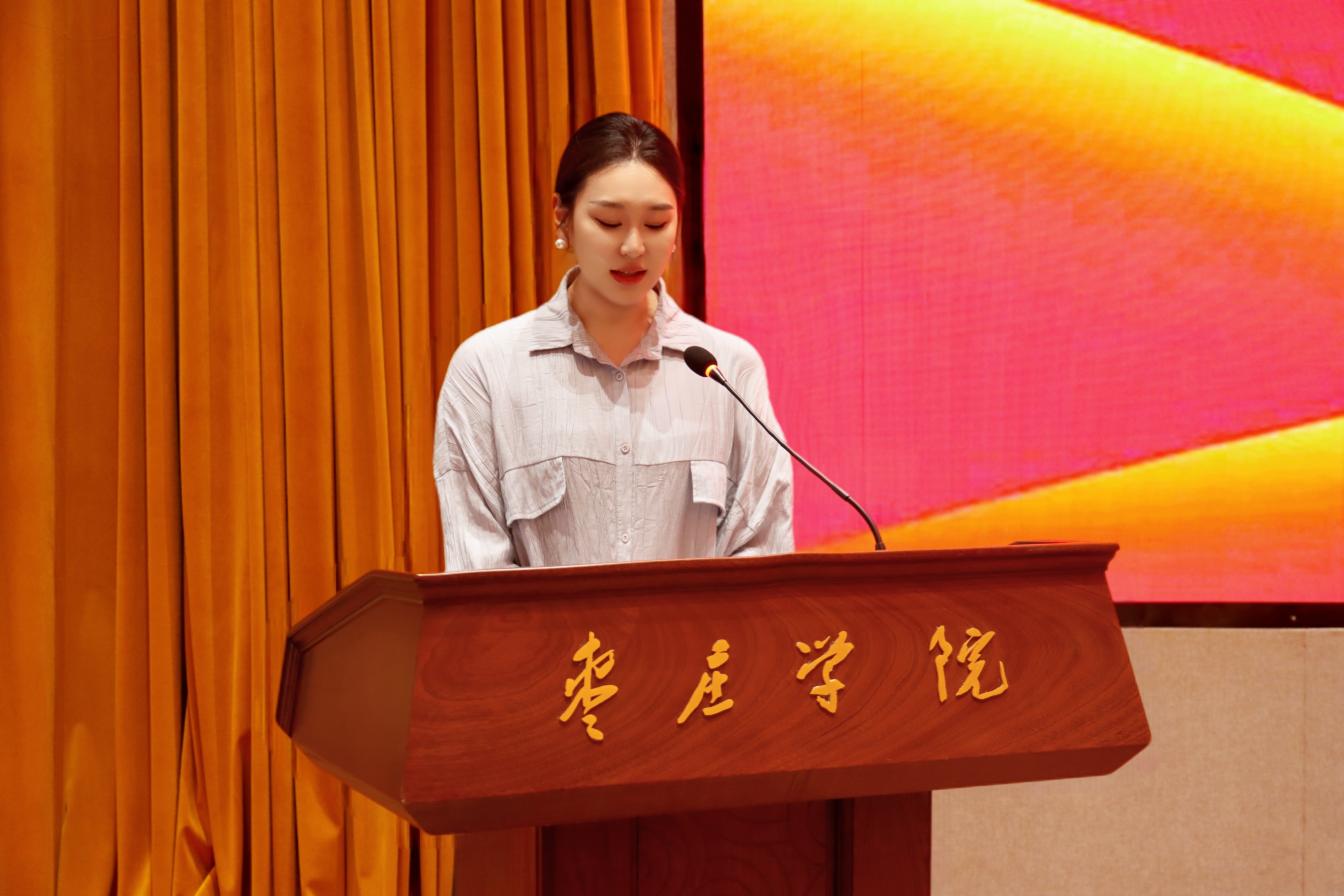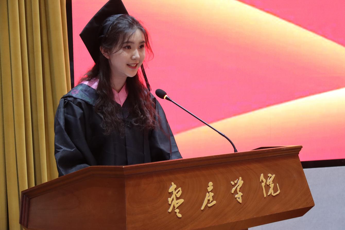在校生代表李一帆祝愿所有师生:乘风破浪,扬帆万里,勇往直前,踏破荆棘,看见繁花,让青春破茧成蝶,永远闪亮。毕业生代表王艺霏发表毕业感言,她号召同学们不负时代,不负韶华,以青春之我、初春之我、朝日之我、利刃之我,努力践行总书记号召,与祖国共进,与时代同行。时刻铭记并传承:“厚德明道 敬慎固本”的校风,恪守:“兼爱、尚贤、博物、戴行”的校训,践行“奉献、友爱、互助、进步”的志愿精神。砥砺前行,以优秀的成绩彰显枣院风采。