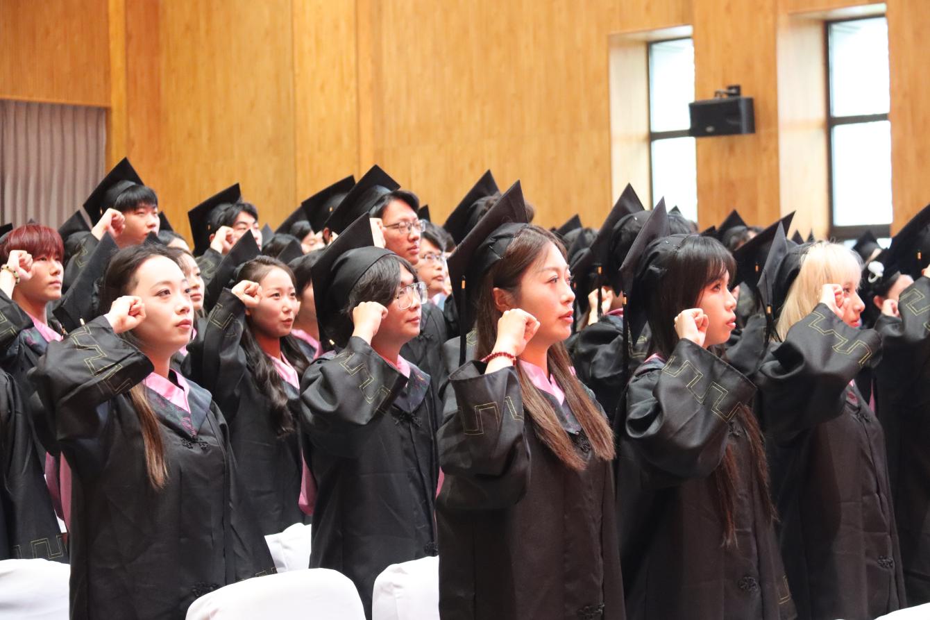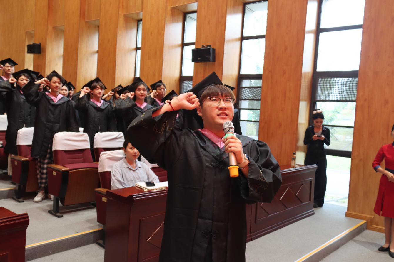 典礼在庄严肃穆的国歌声中拉开帷幕,原员工会主席、老员工艺术团团长胡顺翔带领全体毕业生庄严宣誓:将秉持诚信与勤奋,追求知识与真理。不忘初心、牢记使命,兼爱尚贤,博物戴行,厚德明道,敬慎固本,将以实际行动,为母校争光,为国家发展贡献力量,为实现个人价值而不懈奋斗!铿锵承诺,彰显青春力量。